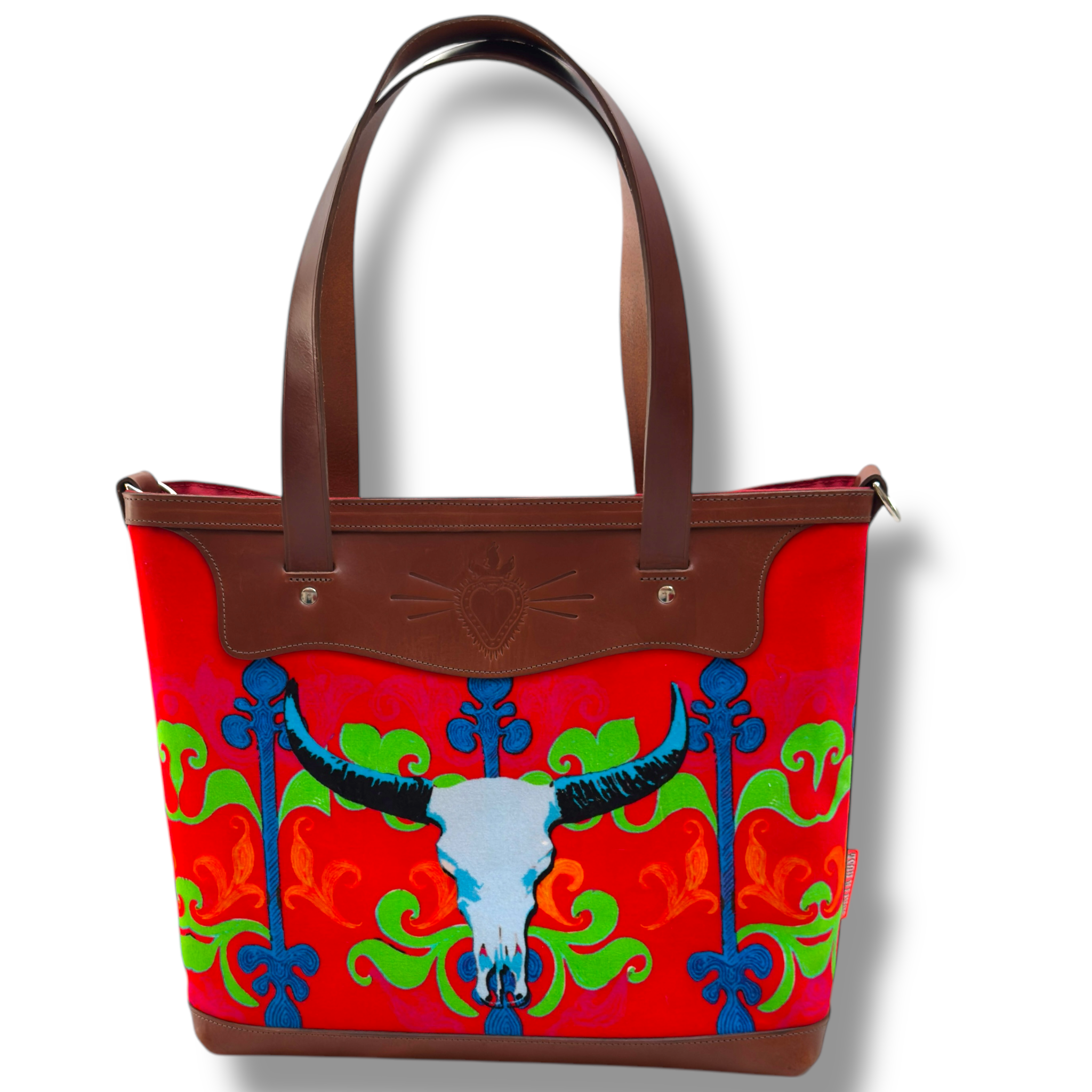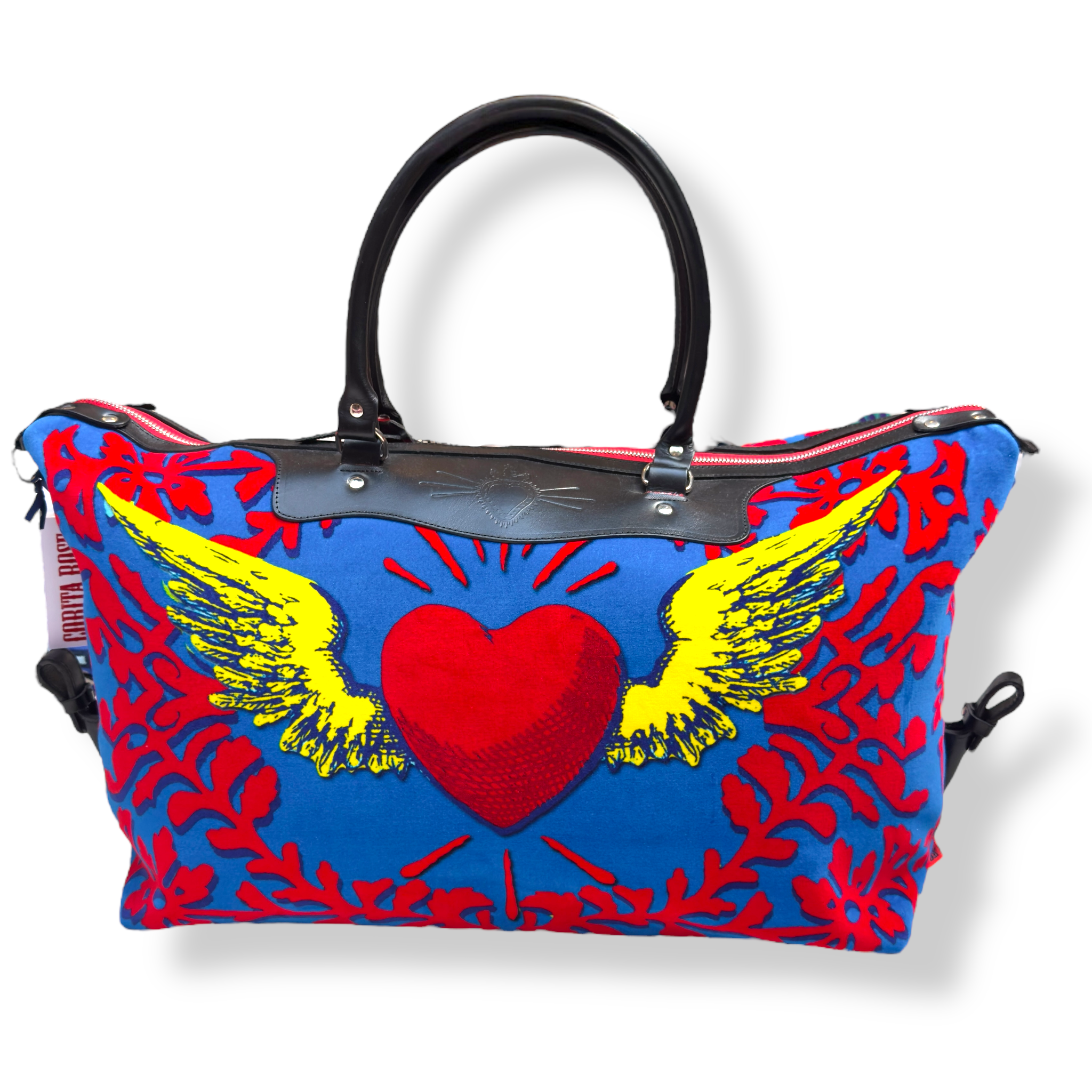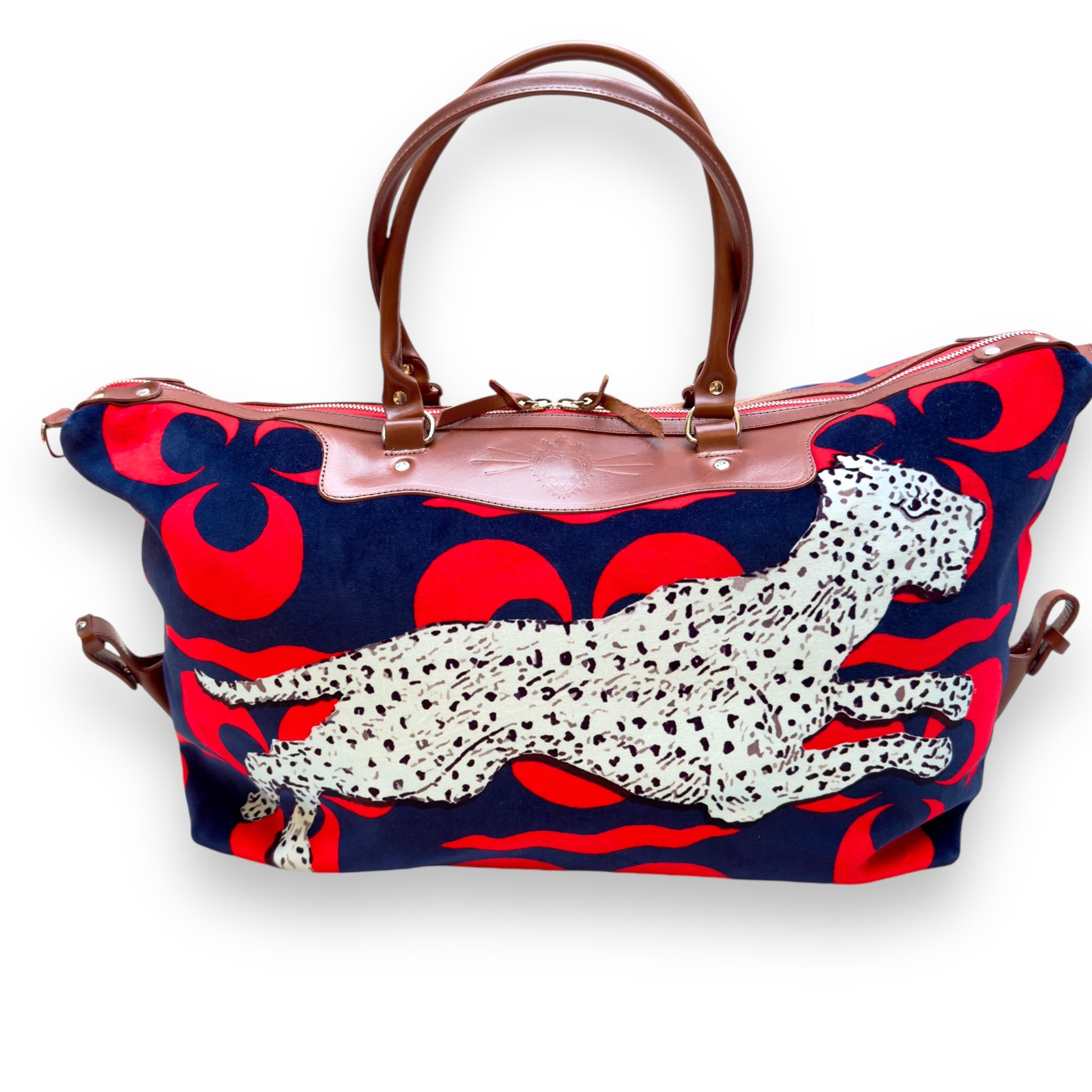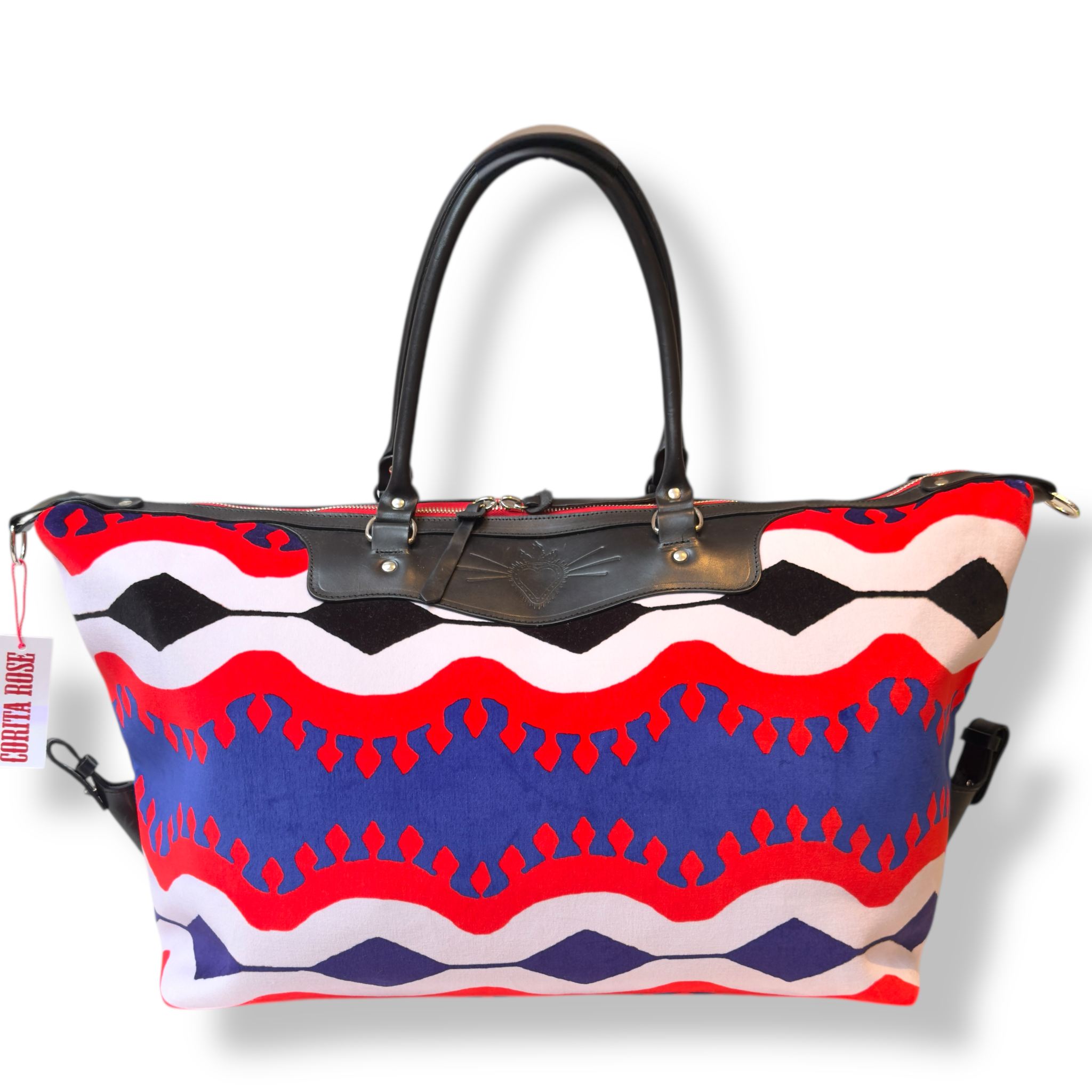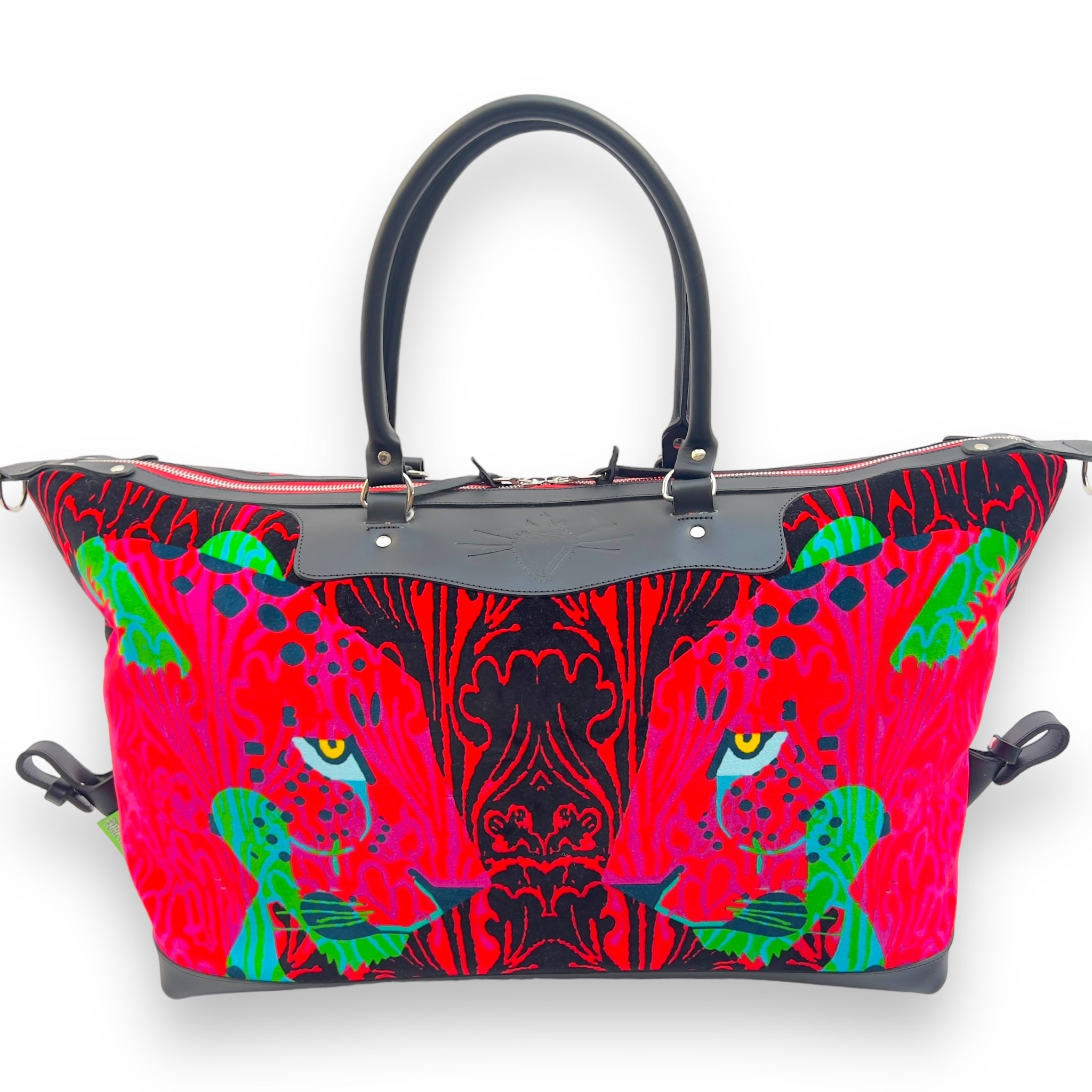 Hand made here in the UK with Corita Rose fabrics & artisanal leather trim.