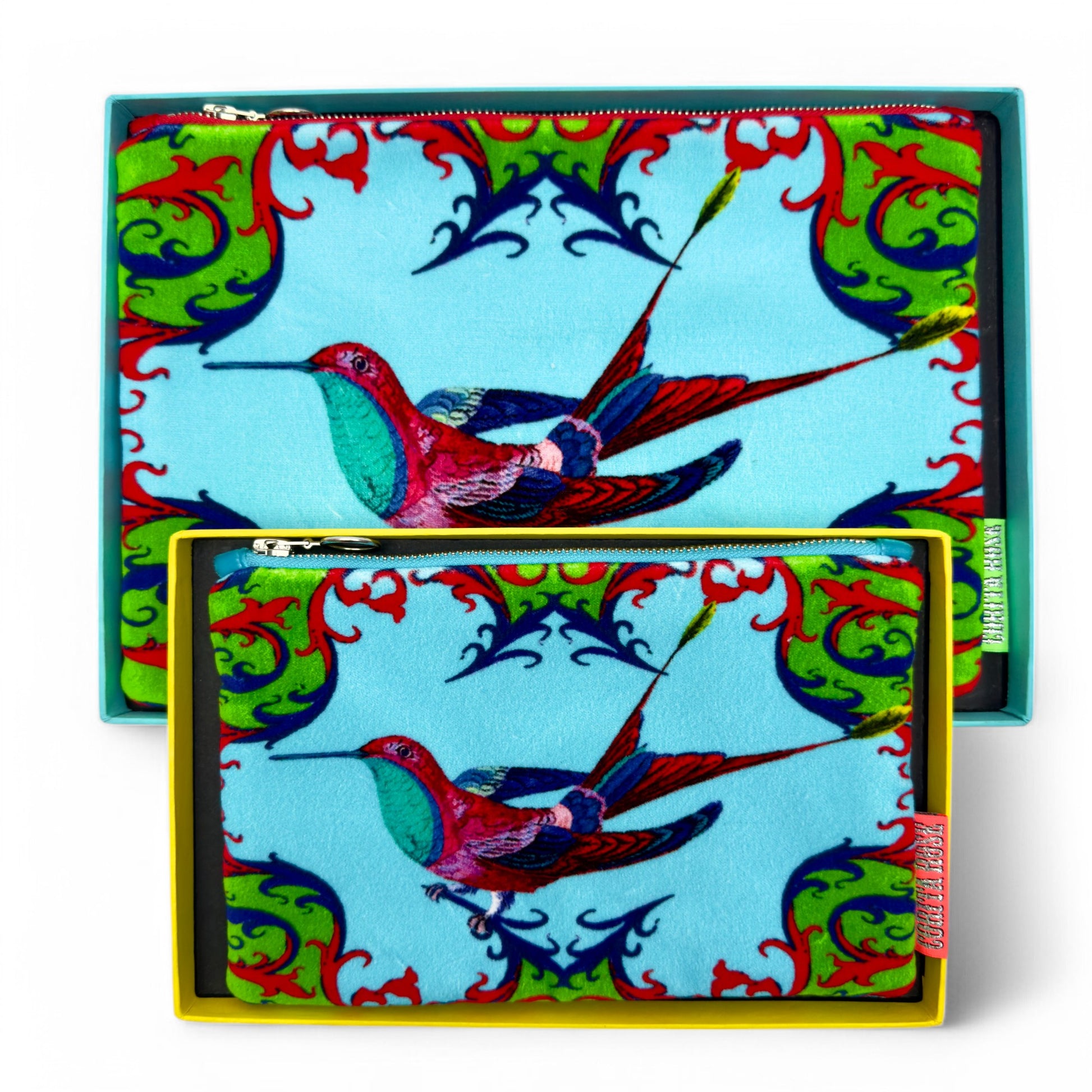 Our Bali Bird clutch is made from cotton velvet and has a red satin interior.