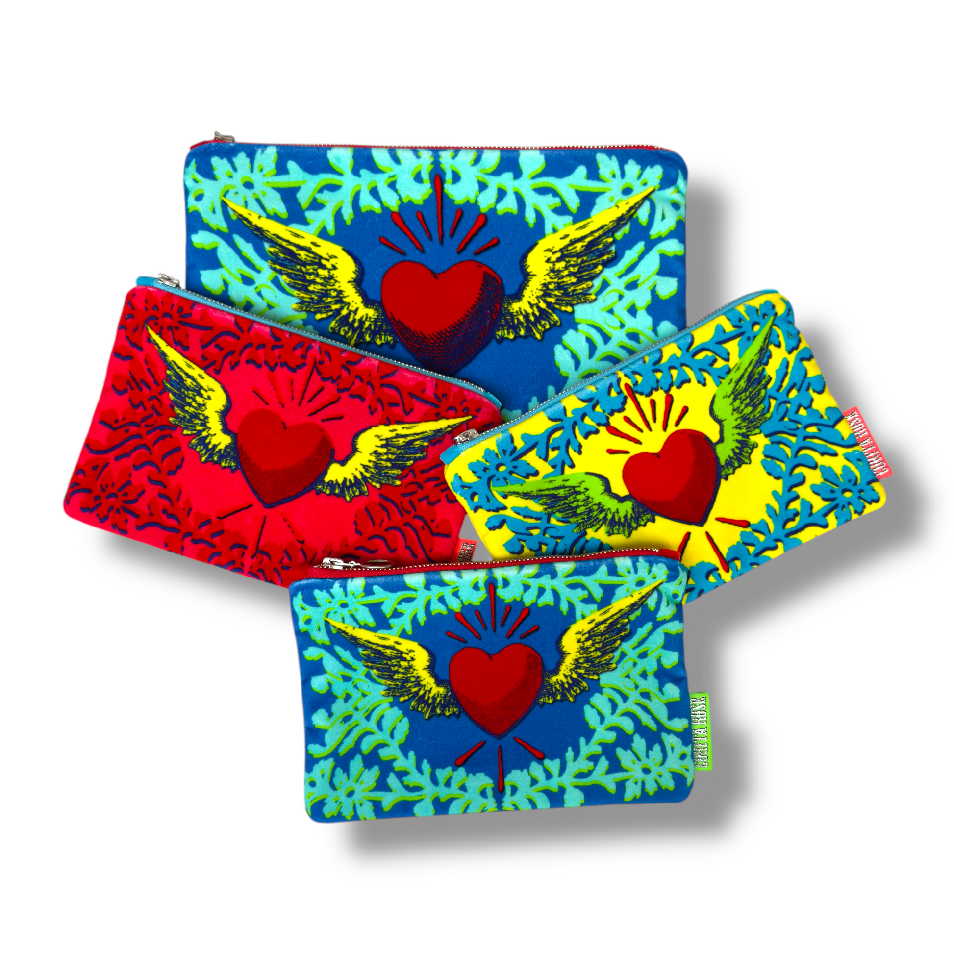 Our Flying Heart clutch is made from cotton velvet and has a red satin interior.