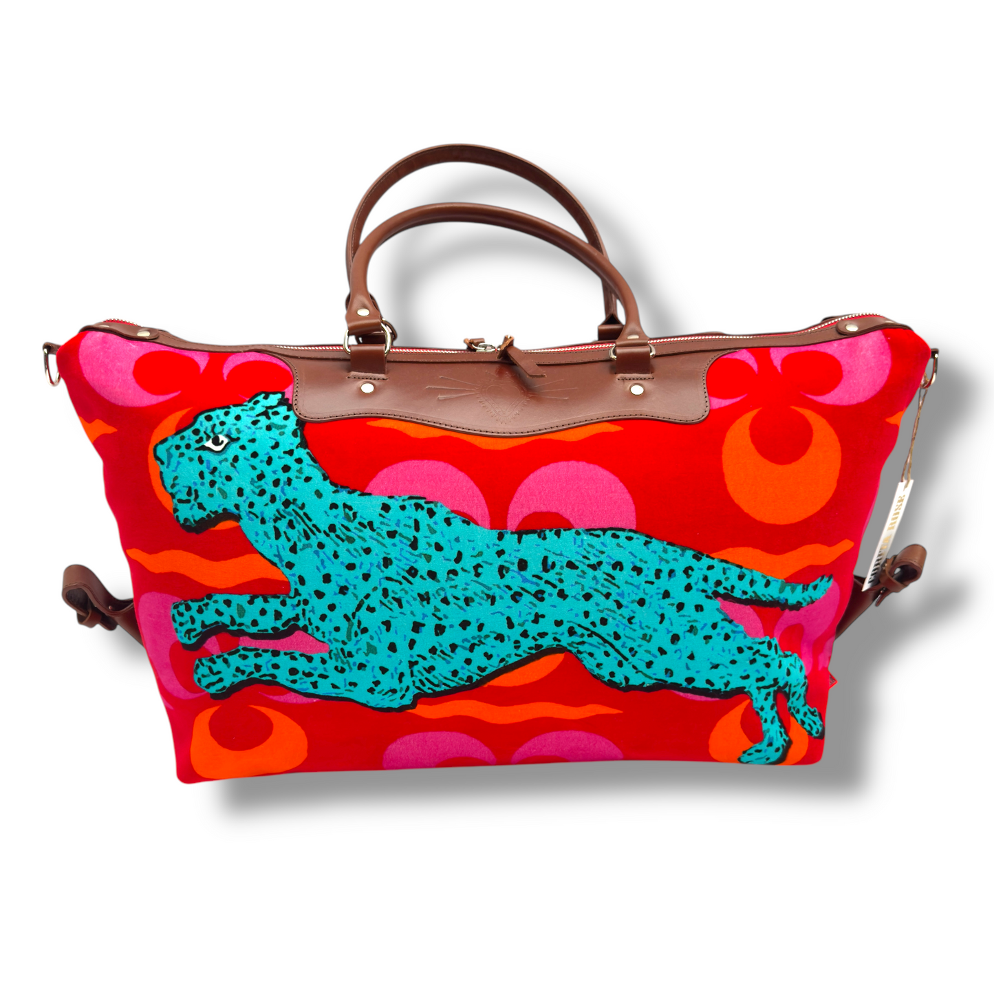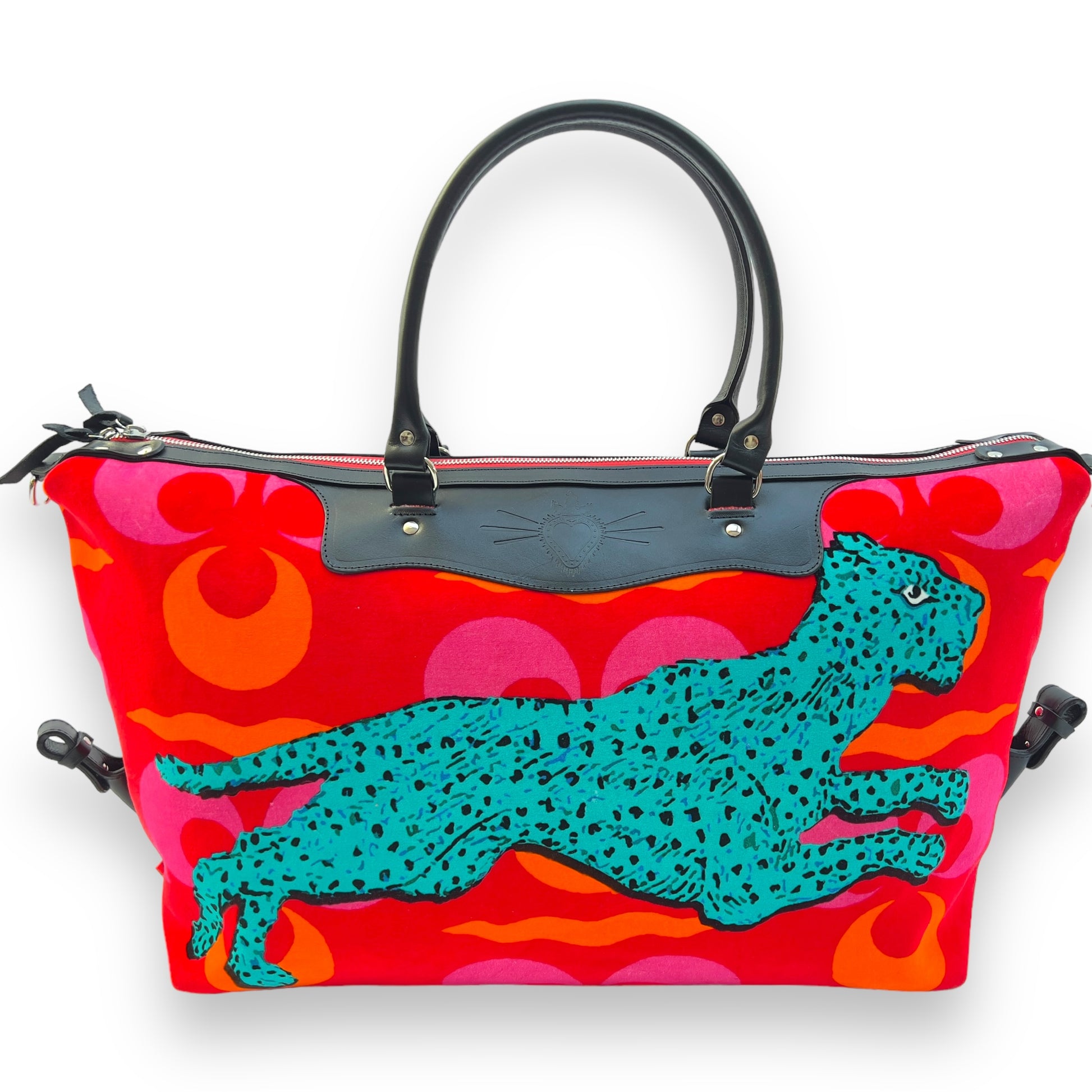 The Running Panther Weekender - This dashing character is a wonderful companion for quick getaways and long weekends.  A joy to pack in - the bag, made from velvet and leather, has a robust interior with internal pockets which can take papers and a laptop.