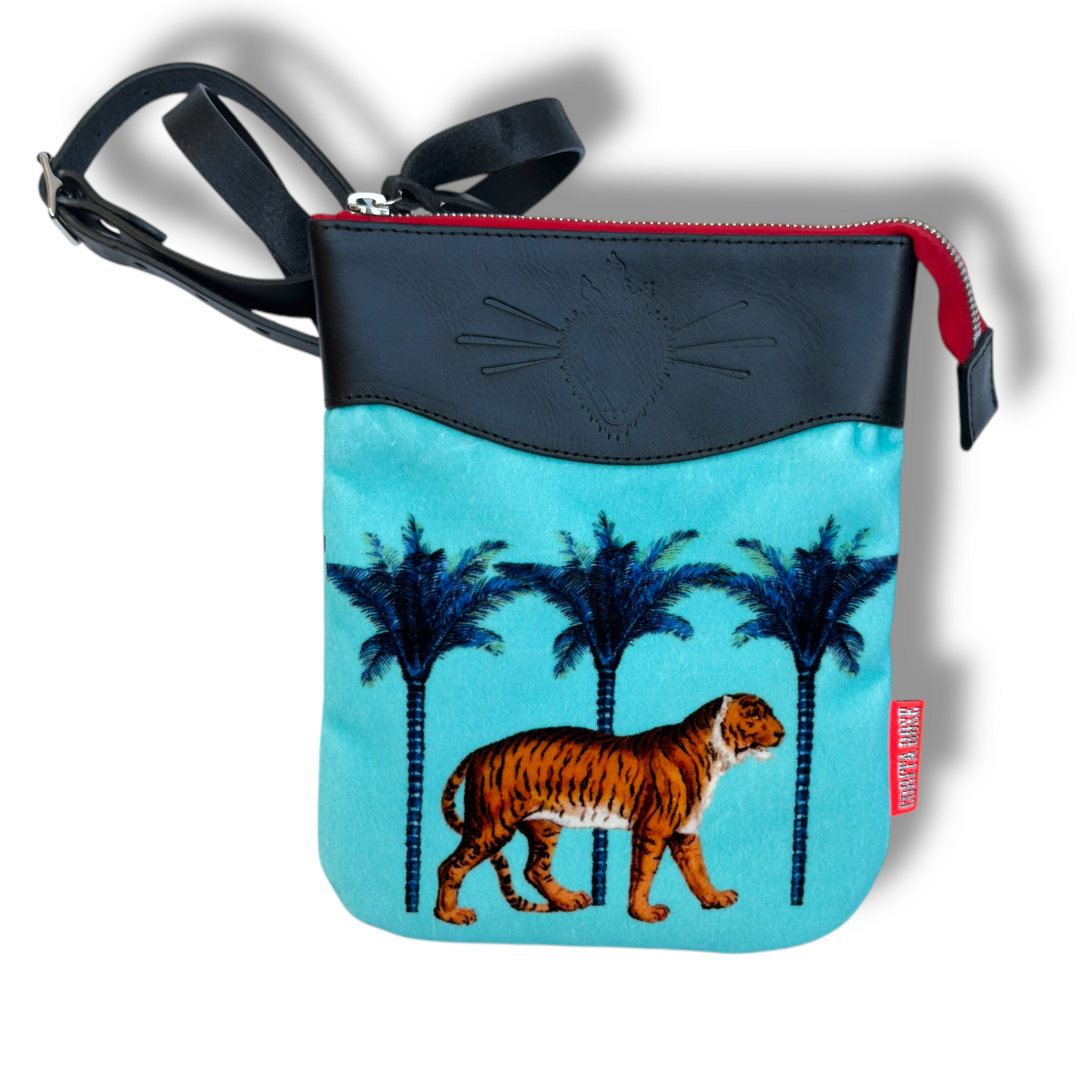 Cut a dash with this beautifully crafted little cross body bag - Sleek and stylish, emblazoned with our Strolling Tiger, this 28cm x 20cm piece is made of the finest leather, strong velvet with a robust canvas interior.